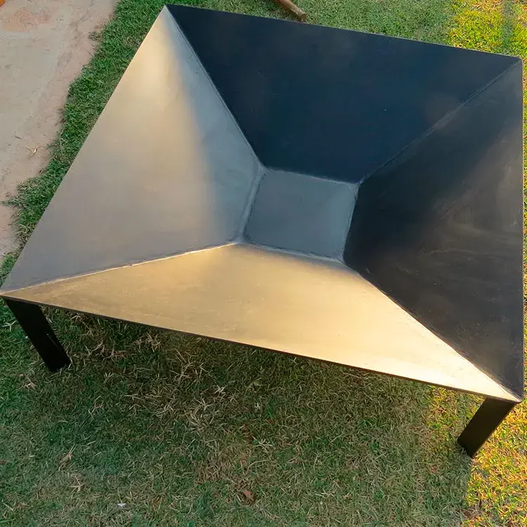 Lareira externa em ferro com centro plano de 20x20cm, dimensões 70x70cm, chapas de 4,70mm e pintura resistente a 600 °C. Perfeita para áreas externas.