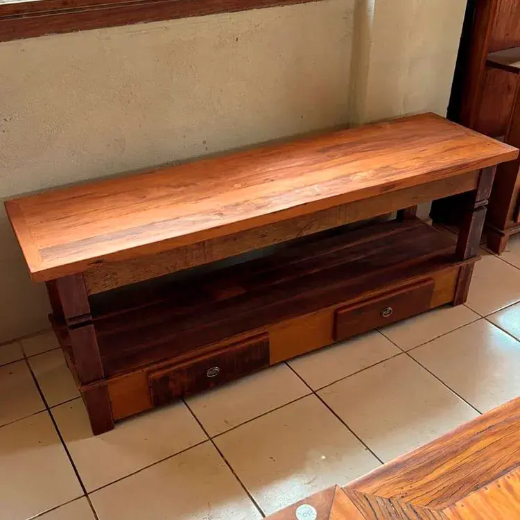 Rack rústico em peroba rosa, com 2 gavetas e puxadores de metal trabalhado, perfeito para agregar estilo e praticidade aos ambientes.
